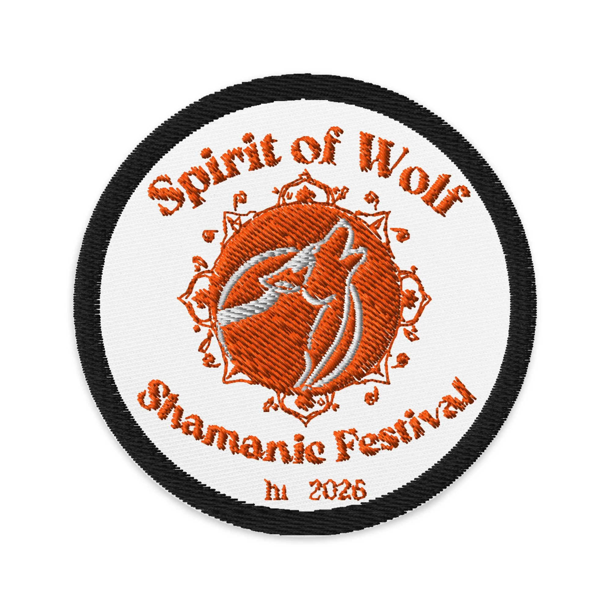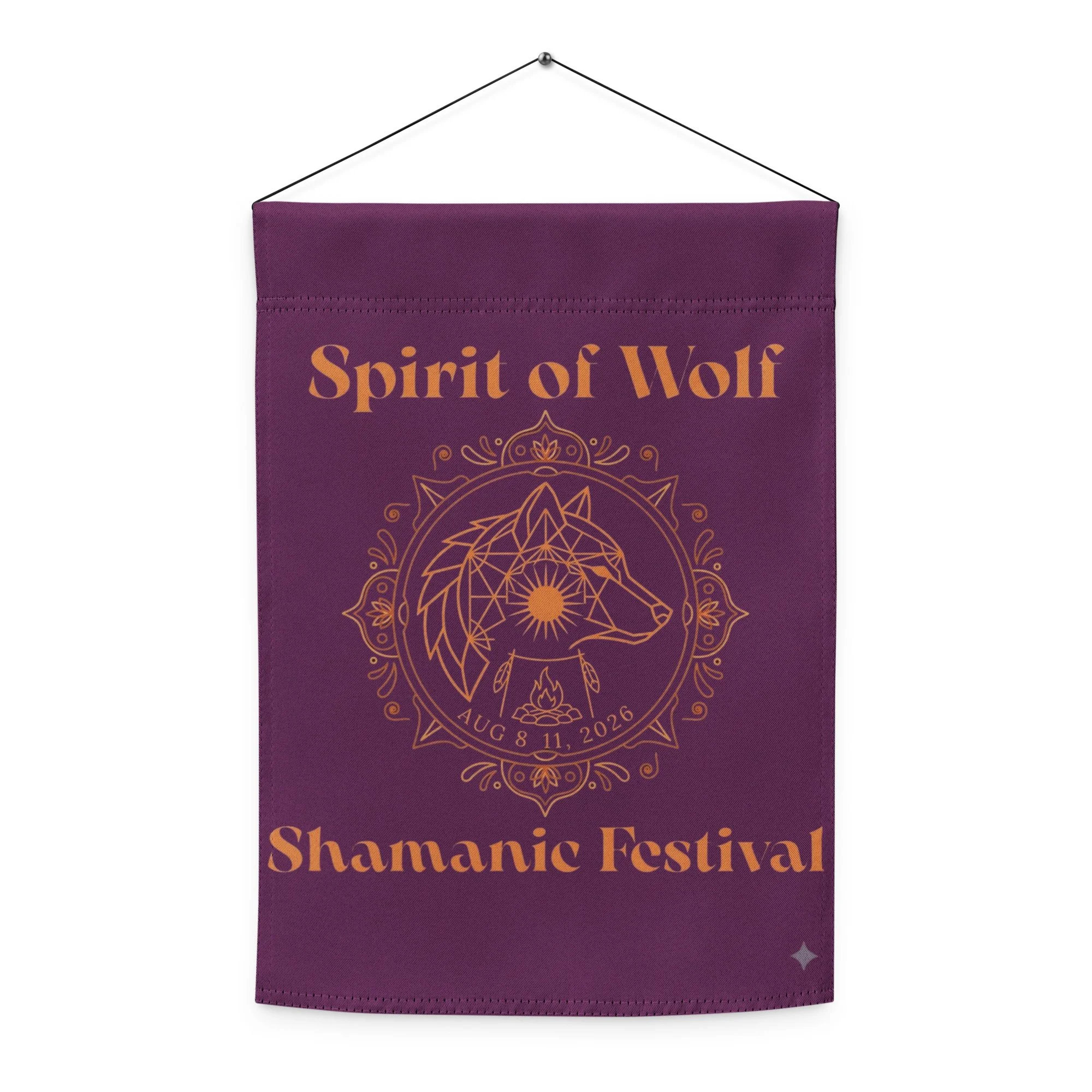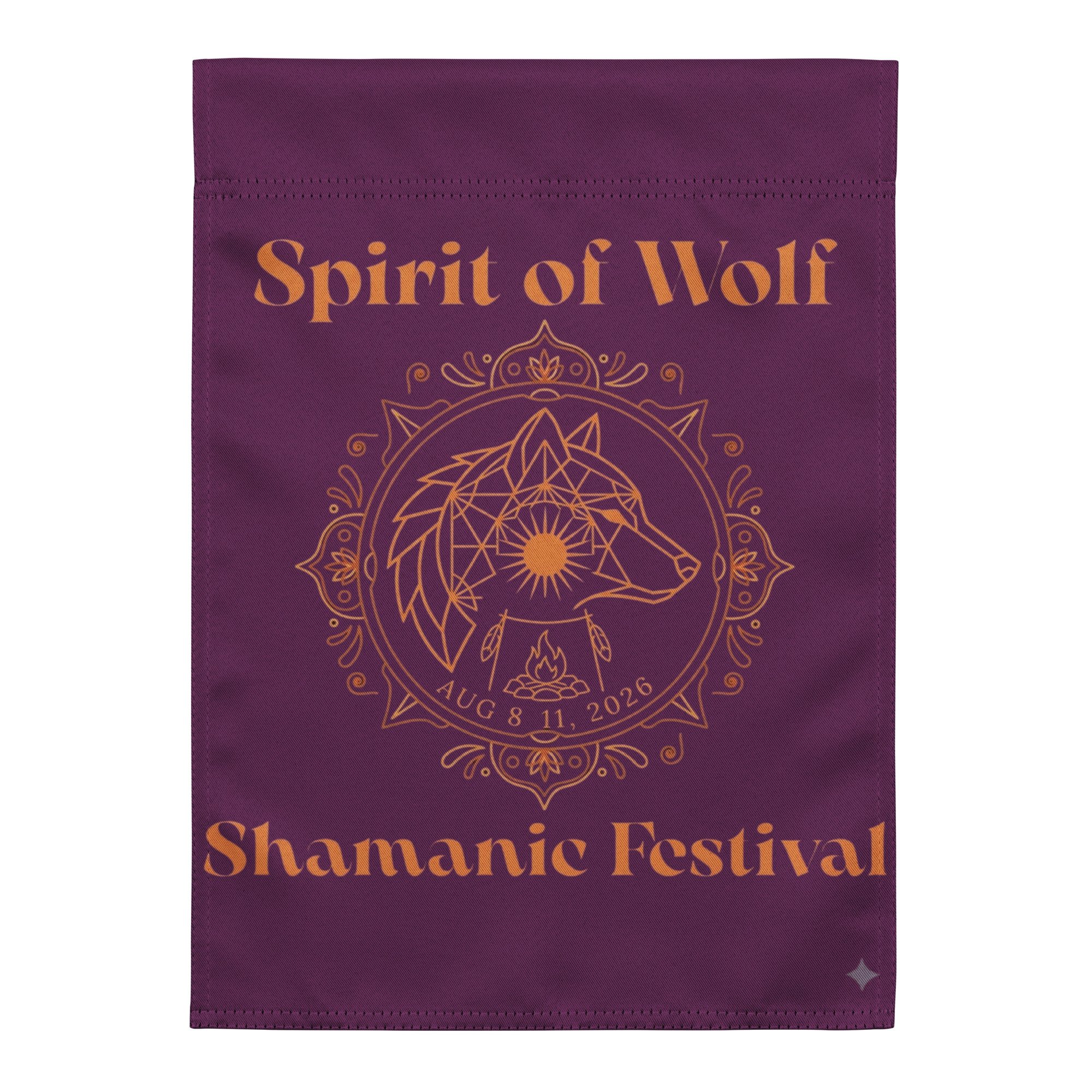 Purple T-shirt with a logo featuring a howling wolf inside a circle, surrounded by decorative patterns. Text reads 'Spirit of Wolf Shamantic Festival Ohio 2026'.